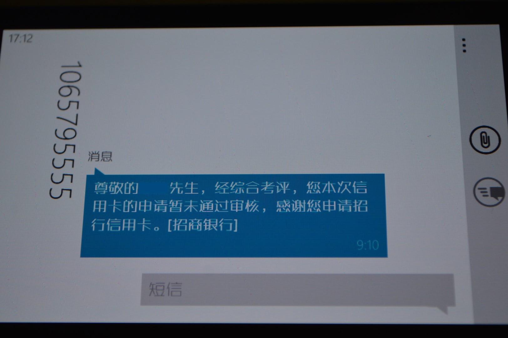 ▲ 最近新到一张建行南航联名Master卡,又开始关注信用卡,了解了想用信用卡刷里程兑机票就是个大坑。偶然注意到了招行的全币种Visa Signature信用卡,随手一试填了申请表,工作空,固话没有,权当一试,没想招行效率奇高,隔天一早就有了上图的结果。